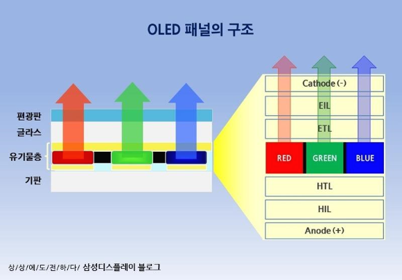 OLED : Organic Light-Emitting Diode(유기발광다이오드), 유기물로 구성된 발광 다이오드를 말합니다.