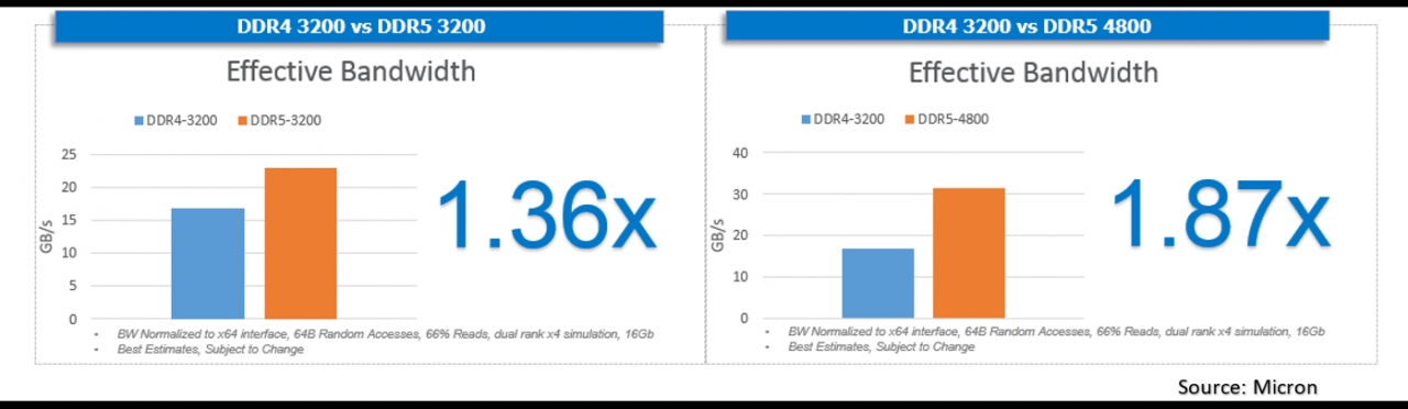 하지만, 삼성, 하이닉스, 마이크론은 이미 DDR5에 대한 개발을 끝마치고 시장이 활성화되기만을 기다리고 있습니다. DDR5는 DDR4보다 속도도 물론 빠르지만, 보다 넓은 대역폭을 가지기 때문에 보다 효과적으로 데이터 입출력이 가능합니다. 따라서, 2014년 이후 정체되어 온 메모리 대역폭이 획기적으로 개선될것으로 기대하고 있습니다.