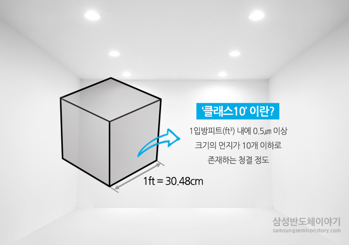 '클래스10'은 1입방피트(ft3) 내에 0.5㎛ 이상 크기의 먼지가 10개 이하로 존재하는 청결 정도를 말합니다. 예를 들어 '클래스1'은 가로/세로/높이가 각각 1피트(ft)인 정육면체 내에 사람 머리카락 직경의 1/1000 크기 정도의 먼지 하나가 존재하는 것으로 비유할 수 있습니다.
