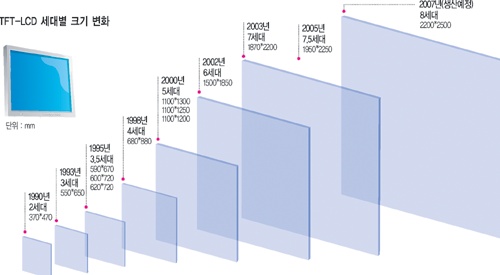 90년대 2~4세대 LCD 기판 Size는 모바일, 모니터, 노트북 등에 적합한 소형 기판이 주를 이루었습니다.
