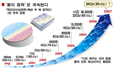 그리고 두번째, "황의 법칙", 여기서 황은 전직 삼성반도체 기술총괄 사장 황창규 사장이 2002년 무어의 법칙보다 한술 더 떠 (-_-) 집적회로를 뛰어넘는 메모리의 발전으로 인해서 앞으로는 1년에 2배씩 용량이 뛰어오를거라고 주장한 법칙입니다.