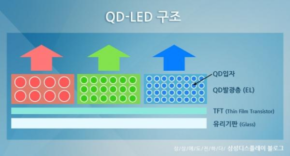 마지막 최종형, QD디스플레이의 끝판왕으로 생각되는 QD-LED 입니다. 이것은 QD 자체를 OLED 처럼 자발광시켜 RGB 각각을 발광시키는 구조로, 무기물의 발광구조이기 때문에 LED의 장점과 QD의 장점을 극대화한 구조라 할 수 있습니다.