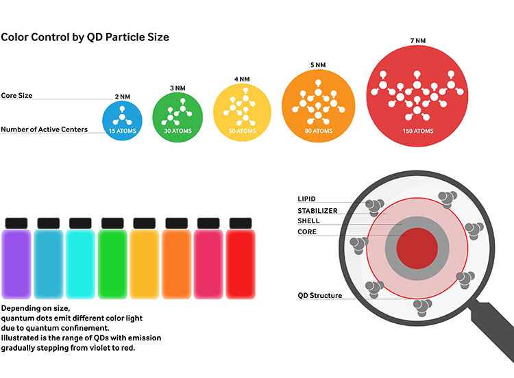 퀀텀닷(QD)은 지름이 2-10nm(나노미터, 10^-9)에 불과한 반도체 입자로 특이한 전기적, 광학적 성질을 지닌 입자를 말합니다. 예를 들어, 퀀텀닷 결정은 빛에 노출되면 특정 주파수의 빛을 방출합니다. 퀀텀닷의 크기와 모양은 반응 시간과 조건을 조절하여 정확하게 제어할 수 있으므로 이 나노 기술을 디스플레이 용도에 맞게 확장할 수 있으며 유용하게 사용할 수 있는 장점이 있습니다.