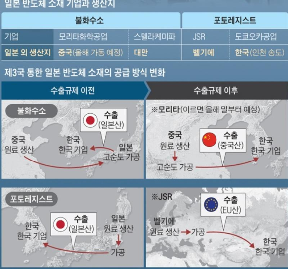 코너에 몰린 일본 업체들은 일본 정부에 끽 .. 소리는 못내고 우회적으로 한국에 몰래몰래 수출을 타진 중입니다. 편하게 한국 업체에 기대어 돈 벌 수 있었던 일본 소재 업체들은 무슨 밀반입 마냥 일본 정부 몰래몰래 한국에 굽신굽신 소재 수출 중이죠.. 그러게 총리를 잘 뽑았어야지...