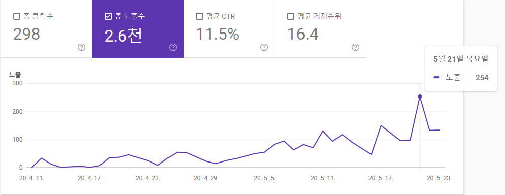 40일 정도 경과한 5/21일엔 일일 노출 254건으로 증가하였고, 안정적으로 100건 이상 조회되는 것을 볼 수 있습니다.