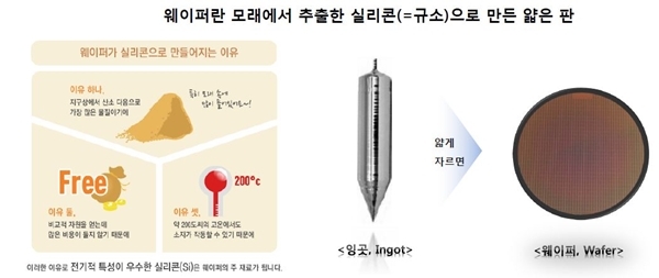 먼저 반도체의 기판 역할을 하는 Wafer의 재료로 쓰입니다.