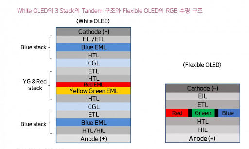 LG디스플레이는 Tandom 구조 OLED를 TV에 먼저 적용시키면서 기술력을 입증했는데요. Tandom 구조란 기존의 1 Stack 구조에서 벗어나 CGL Layer를 이용하여 2~3단계 Stack으로 적층시켜 병렬로 발광하여 수명을 늘릴 수 있는 방법입니다.